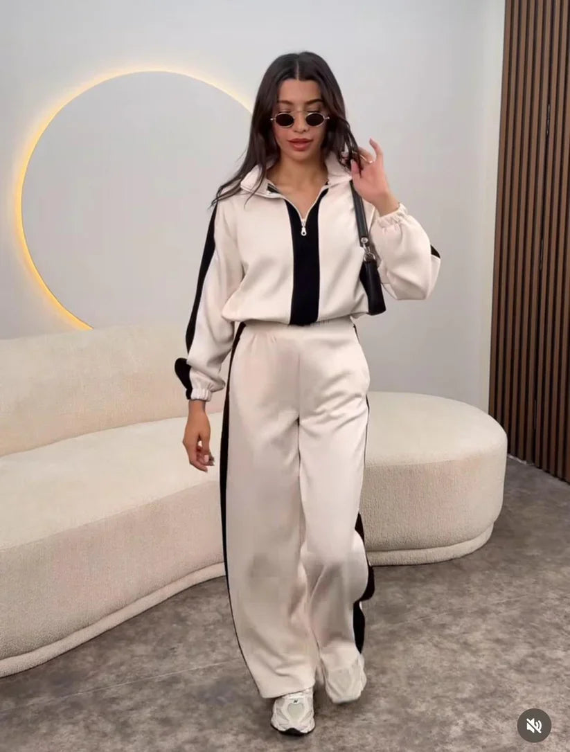 📦 Package Includes: 1 x Twin Color Zipper Jacket (Beige & Black) 1 x Matching Track Pants